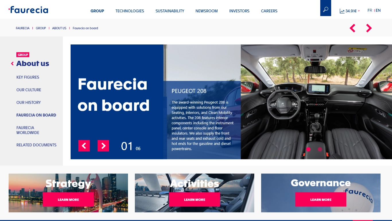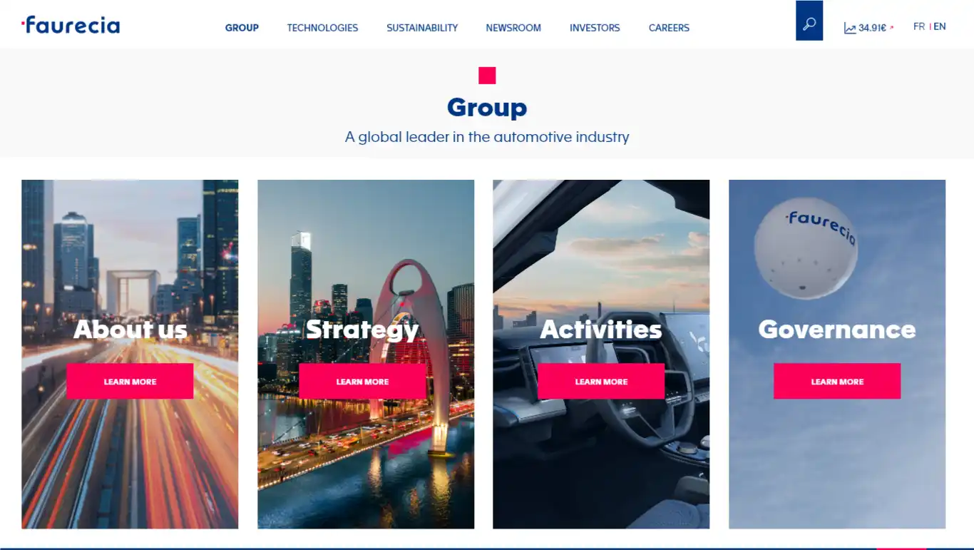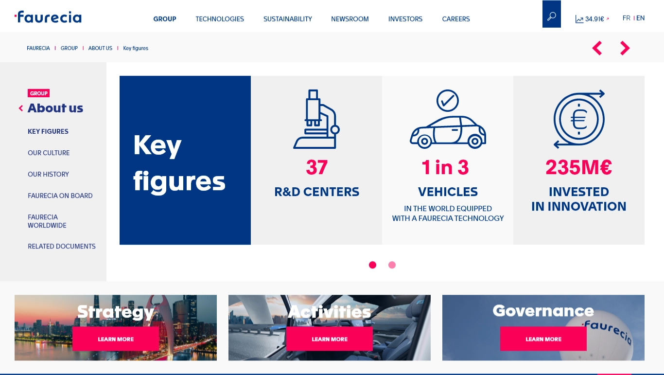 Faurecia est un acteur majeur de l'industrie automobile. Le groupe communique sur trois grands sujets : la mobilité durable, le cockpit du futur et l'hydrogène. Le problème, c'est que tout était mélangé dans une même interface. Trop d'informations, pas assez de repères.